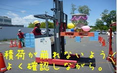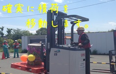 競技内容*実技競技・・・・・フォークリフト基本操作手順に基づく荷役運搬を特設コースで競技。荷役作業の操作手順正誤と安全運転と確認を減点方式で審査(リーチ、カウンタともに全60項目)。競技者どうしの採点による加点有。