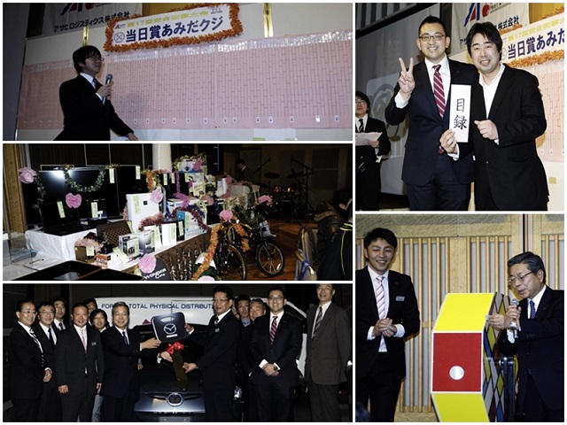 そして、いよいよお楽しみの大抽選会が行われました。当日賞25本、無事故賞80本(30本増)が準備されましたが、無事故賞の1等は、普通乗用車1台で、そのほか40型4Kテレビ、ノートパソコン、ハイビジョンムービーカメラ、ディズニーリゾートペアチケット、お米30キロ、松坂牛ギフト券等々、豪華賞品が陳列棚にずらり並んだ熱気の中で、抽選が行われました。最初は当日賞の抽選を大型あみだクジで、無事故賞はジャンボがらポン抽選機で実施しました。テンポよく進行する抽選で、当選者が決まる度に大きな歓声とどよめきに包まれました。抽選会が進み注目の無事故賞1等のクジは、小川副会長が抽選機を回し、ポンと出てきたカプセルを開け、当選番号をゆっくり読み上げると、大きなどよめきの中、「当たった」と叫び壇上に向かう姿が見えました。