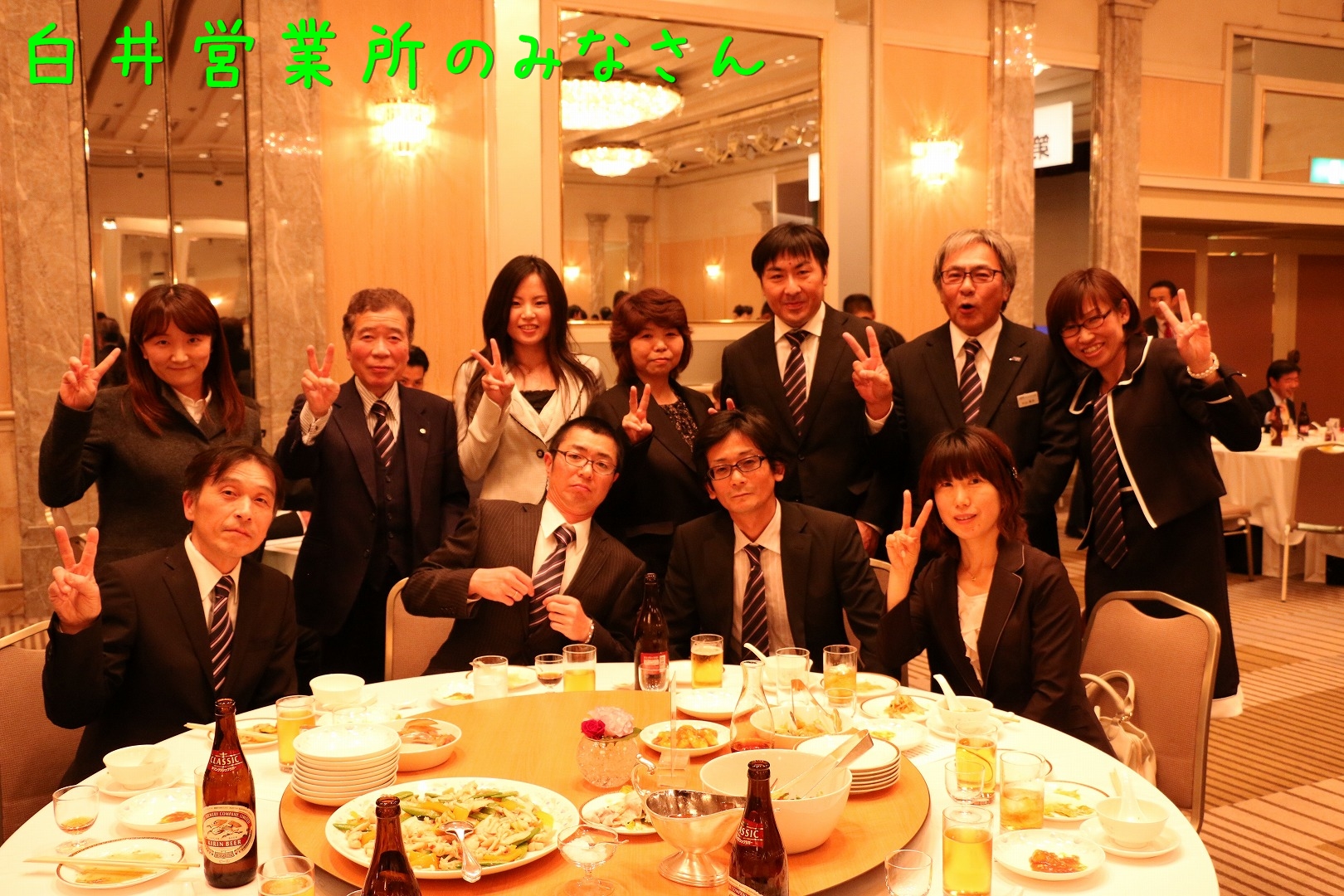 また、本年5月末を以って代表取締役会長を退任し、取締役相談役に就任する横塚会長に、社員より感謝をこめてサプライズのイベントを行い、最後に皆で写真撮影を行い、閉会となりました。